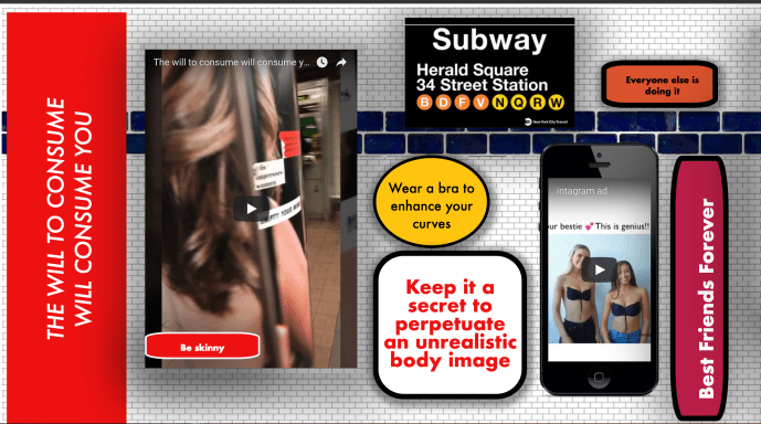 New Media & Digital Design Final Project, The Will to Consume Will Consume You, is an interactive study of media presented to young millennial women. Inspired by a sticker over the eyes of a woman featured in an advertisement located in Midtown Manhattan’s Herald Square. Upon entering the site, you are transported into a typical New York City…
